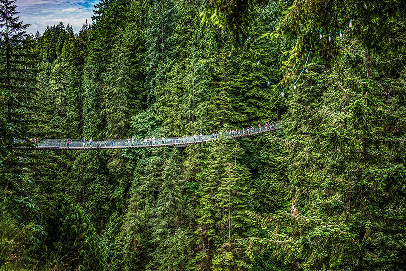 Direkt bei Vancouver wartet ein weiteres Ziel auf Schwindelfreie: die 137 Meter lange Hängebrücke Capilano Suspensio Bridge. Sie befindet sich rund 70 Meter über dem Boden und quert den Capilano River. Sie besteht aus Beton und Stahlseilen, was eine klare Verbesserung zu ihrem Vorgänger mit Holz- und Hanfstrukturen ist. Die frei schwingende Brücke kann bequem ab Downtown Vancouver erreicht werden. Auch ein Story Centre ist vorhanden und erzählt mehr über die Brücke und die Umgebung.