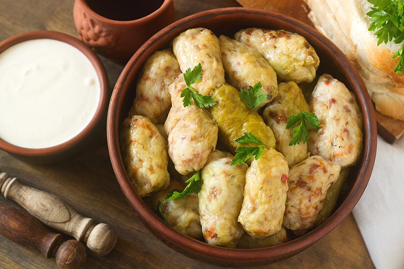In Rumänien wird vor allem deftig und traditionell gegessen, wobei die bäuerliche Vergangenheit in fast jeder Mahlzeit erkennbar ist. Neben würzigen Fleischgerichten landet hier auch häufig Fisch auf eurem Teller und für ein Dessert solltet ihr danach noch ein wenig Platz lassen. So könntet ihr zur Vorspeise eine saure Ciorba-Suppe oder einen Auberginen-Salat bestellen. Als Hauptgang gibt es Röllchen aus Hackfleisch, wie ihr sie auch aus der kroatischen Küche kennt, oder die berühmte Sarmale, eine Kohlroulade mit Füllung. Vegetarier bestellen den Maisbrei Mămăligă oder setzen auf regionales Gemüse. Mit einem Wein oder einem Schnaps als Absacker stoßt ihr anschließend auf einen gelungenen Rumänien-Urlaub an.