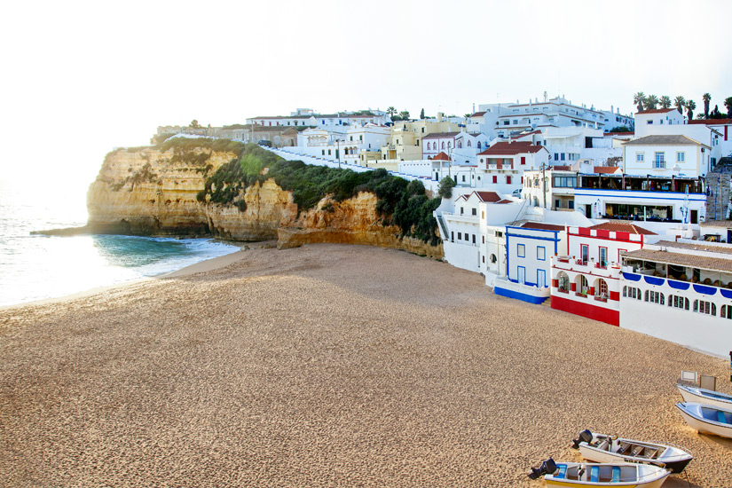 Goldener Sand, schroffe Steinfelsen und im Hintergrund die weißen Fischerhäuser markieren die Kulisse des Strandes von Carvoeiro. Da er verhältnismäßig klein ist, müsst ihr ihn aber während der Hauptsaison wahrscheinlich mit vielen anderen Urlaubern teilen. Fischerboote warten darauf, euch zu Ausflugszielen wie der Benagil-Höhle zu bringen. Zudem gibt es vor Ort zahlreiche Cafés und Restaurants, die euch mit köstlichen Leckereien aus der Region stärken.