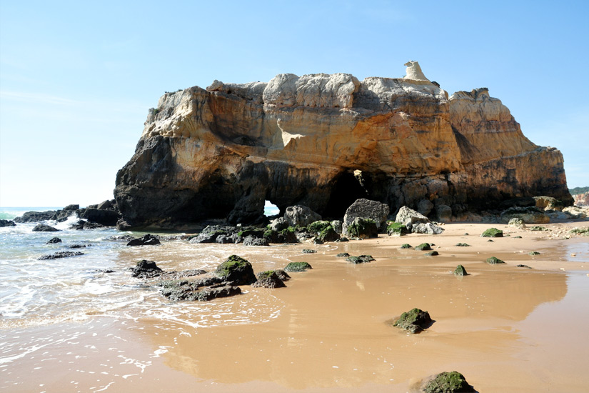Rund zwei Kilometer von Carvoeiro entfernt, erwartet euch am Fuße eines Felsens aus Sandstein dieser herrliche Strand mit goldfarbenem und sauberem Sand. Es gibt eine Strandbar und Restaurants für eine Stärkung zwischendurch, dennoch wirkt alles durch die Umgebung irgendwie naturbelassen. Zum Schwimmen ist der Strand weniger geeignet als zum Sonnenbaden, denn das Wasser wird schnell tief und es gibt viele Felsen. Ihr solltet euch nur hineinwagen, wenn ihr zu den erfahrenen Schwimmern gehört.