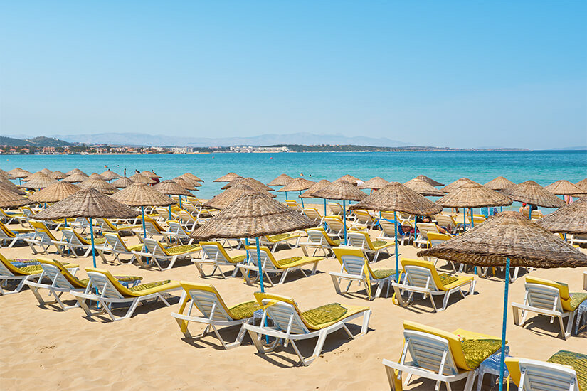 Çeşme ist ein Paradies für Badeurlauber, die sich die Sonne auf den Bauch scheinen und den Alltag hinter sich lassen möchten. Traumhafte Strände locken mit türkisblauem Wasser und puderzuckerfeinem Sand, der zwischen den Zehen entlanggleitet.