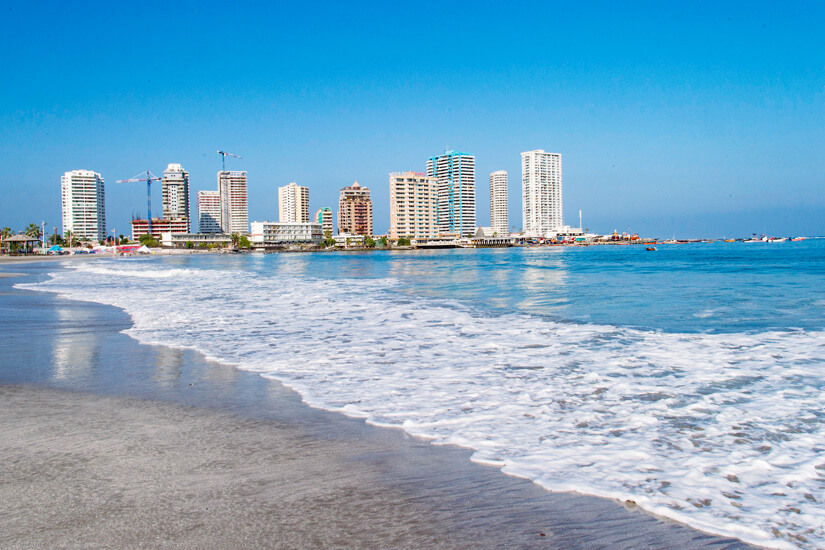 Dieser lebhafte Strand erinnert an die traumhaften Küstenabschnitte in Miami, eingebettet zwischen moderner Stadtarchitektur, der atemberaubenden Küstenlinie und ausgedehnten Wandergebieten. Das Ufer an der malerischen Küste der Hafenstadt Iquique ist mit exotischen Palmen und türkisblauem Meer ein Paradies für Erholungssuchende und Sportbegeisterte. Der riesige Sandstrand ist zweifellos die Hauptattraktion der Stadt. Ihr genießt das Wasser des Pazifischen Ozeans oder entspannt in der Sonne während ihr das bunte Treiben und die sanften Wellen beobachtet. Für den perfekten Komfort bieten Mietgeschäfte Sonnenschirme und Liegen sowie sanitäre Anlagen an.