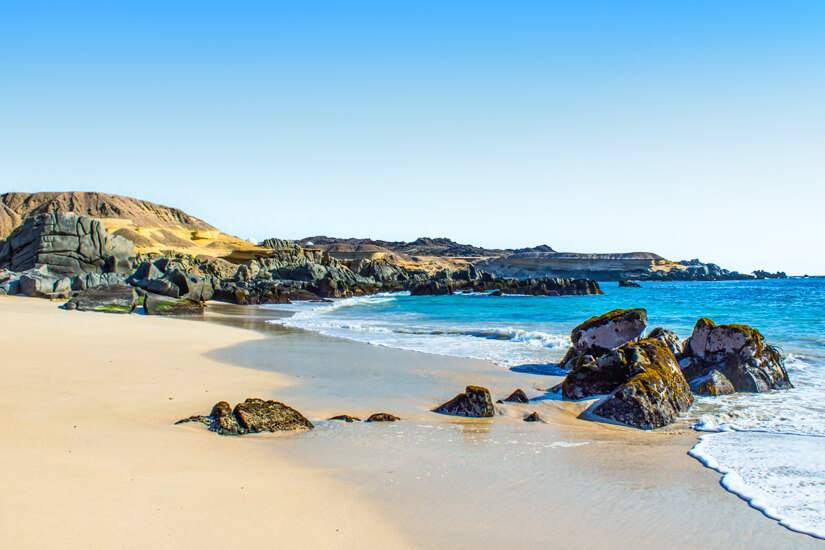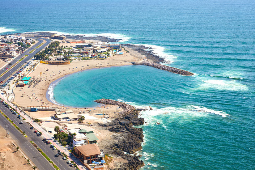 Eine Bucht mitten in der Wüste ist die Playa El Laucho südlich von Arica. Die „Stadt des ewigen Frühlings“ liegt im Norden von Chile – nahe der Grenze zum Nachbarland Peru. Die idyllische Küstenlandschaft zieht euch mit seiner spektakulären maritimen Umgebung und einer atemberaubenden Aussicht auf den Pazifischen Ozean in den Bann. An der Playa El Laucho begeistern euch ein weicher und weißer Sandstrand, der sich an der kompletten Küste erstreckt. Der fantastische Ausblick auf das Meer kommt auch bei Spaziergängern gut an, die den Sand und das Wasser unter ihren Füßen spüren möchten.