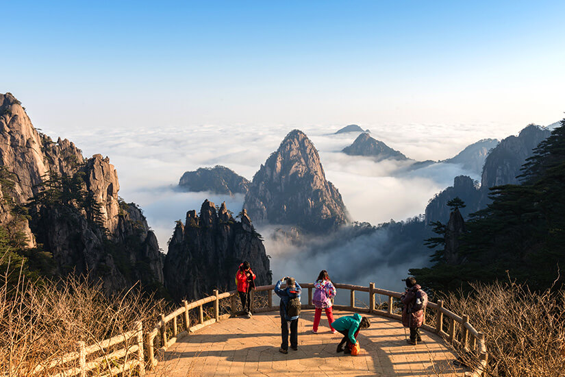 Etwa 3 Stunden südwestlich von Hangzhou findet man die Stadt Huangshan und das benachbarte, gleichnamige Gebirge. Schroffe und teilweise skurril geformte Felsen mit empor kletternden Kiefern inmitten eines Wolkenmeeres, das sich durch heiße Quellen in den Gebirgstälern bildet: so wird das Huangshan Gebirge seit Jahrhunderten beschrieben und von chinesischen Malern skizziert.