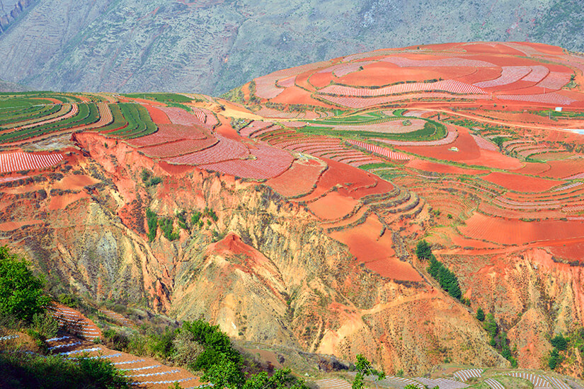 Besonders sticht das Dongchuan Rotland, nahe Kunming gelegen, durch seine breitgefächerten Erdfarben heraus. Besonders im Frühjahr und Herbst, wenn die Felder noch nicht bzw. nicht mehr bewachsen sind, zeigt sich die Landschaft phänomenal in dunkelroten, lila und ziegelroten Farben. Zusammen mit dem blauen Himmel gibt dies, entlang einer 50 km breiten Bergkette, ein wunderbares Farbspiel und weltweit einzigartiges Fotomotiv. Perfekte Aussichtspunkte, um dies bei Sonnenauf- und -untergang einzufangen sind Damakan, Wafang Liangzi oder die River Snail Bay. In der Umgebung sollte man den Steinwald Welt Geopark, die Yuanyang Reisterrassenfelder oder die landschaftlich reizvolle Lijang-Hochebene gesehen haben.