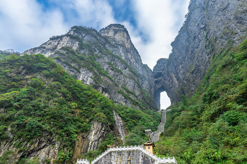 Von der Innenstadt Zhangjiajies geht es entweder mit der längsten Seilbahn der Welt oder auf der Himmlischen Allee hinauf zum Tianmen-Gipfel, einer der top China Sehenswürdigkeiten. Besucht hier die 130 Meter hohe Tianmen-Höhle (auch Treppe zum Himmel genannt), über deren 999 Stufen und unterirdischer Rolltreppe man hinauf zum Tianmen-Plateau gelangt. Oben angekommen warten hier verschiedene traumhafte Rundwege, einer der weltweit spektakulärsten Skywalks, der teilweise gläserne Tianmen Walkway, der Tianmen-Tempel und die einst längste freischwebende Glasbodenbrücke auf eure Erkundung. Viel Spaß!