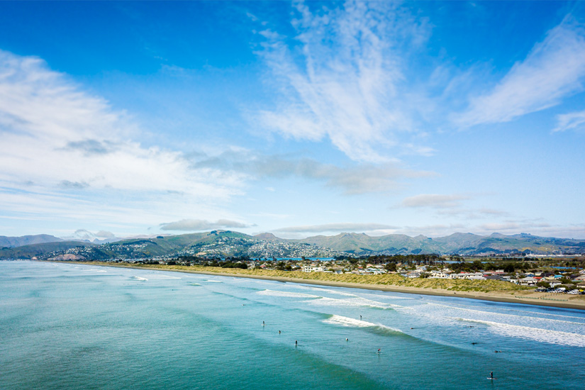 Die schmale Südinsel Neuseelands hat eine lange Küstenlinie am Pazifik und dementsprechend viele Badestellen. Christchurch verfügt über einen langen Strandstreifen im Norden. Hinzu kommen tolle Strände in der unmittelbaren Umgebung.