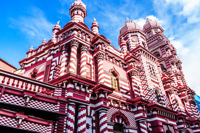 Die muslimische Bevölkerung Colombos kann ebenfalls einige eindrucksvolle religiöse Gebäude vorweisen: Darunter ist sicherlich die bekannte Jami Ul-Alfar Moschee zu nennen, die aufgrund ihrer rot-weißen Gestaltung auch schlicht als “rote Moschee” bezeichnet wird. Sie liegt im Basarviertel Pettah und darf von Touristen nicht-muslimischen Glaubens lediglich samstags bis donnerstags außerhalb der Gebetszeiten besichtigt werden.