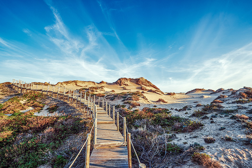 Bewegt euch durch diesen Freiraum, indem ihr durch den Naturpark „El Estrecho“ wandert, zu dem das Dünensystem gehört. Ihr werdet einige Pflanzenarten entdecken: Wacholdersträucher und Sadebäume, Pinien, robusten Strandweizen und Strandhafer. Auch Disteln und Kakteen sind in großer Zahl heimisch, was das Wüstenfeeling abrundet. Wählt ihr den Wanderweg von Bolonia zum Faro Camarinal, kommt ihr an der archäologischen Stätte „Baelo Claudia“ vorbei, seht einen Leuchtturm und jede Menge Surfer, die auf dem Meer entlang der Küste die Wellen reiten.