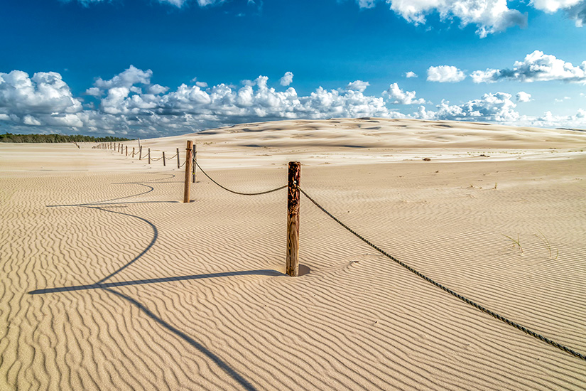 Die häufig anzutreffenden und wohl bekanntesten Küstendünen finden sich auf der ganzen Welt und entstehen durch Sandpartikel, die sich durch Windbewegungen vom Meer sammeln und ablagern. Man findet sie in Abgrenzung zu Binnendünen in der Nähe einer Küste, denn der Wind trägt den Quarzsand vom Strand ein Stück weit landeinwärts, wo er sich zwischen Pflanzen ablagert und zu einem natürlichen Küstenschutz wird. Oft spricht man synonym von Wanderdünen, da die lose liegenden Sandmassen nicht auf Dauer an einem Ort verbleiben, sondern durch die Windbewegungen „wandern“. Auch in Europa sind solche beeindruckenden Dünenlandschaften anzutreffen. Wir nehmen euch zu den Stationen unserer Top 10 mit.