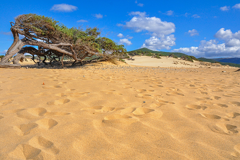 Die italienische Mittelmeerinsel versetzt euch gedanklich in die Sahara, wenn ihr das Gebiet der Dune di Piscinas betretet und euch von goldgelbem Sand umgeben seht. Die Wanderdüne beginnt direkt an der Westküste der Insel, wo der Sand rund sieben Kilometer am Meer entlang verläuft und den Dünenstrand von Piscinas bildet, bevor er insgesamt zwei Kilometer ins Inselinnere vordringt. Dabei kreuzt er das Gebiet „Rio Rosso di Piscinas“, ein Flussgebiet, das hier ins Meer mündet.