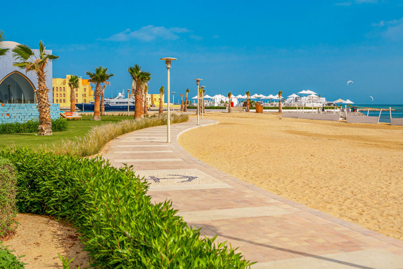 Ein weiterer, flacher Sandstrand befindet sich direkt an der Marina, dem Yachthafen El Gounas. Legt euch hier in die Sonne und flaniert dann am Pier entlang, um euch zur Stärkung in einem der umliegenden Restaurants oder Cafés niederzulassen. Das Wasser ist am Marina Beach allerdings etwas zu flach zum Schnorcheln, aber dafür ideal für Plantschen und Badespaß mit den Kids!