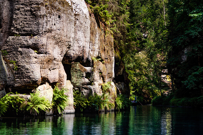 In der Böhmischen Schweiz gilt die Kamnitzklamm als eine der wichtigsten Sehenswürdigkeiten. Diese malerische Ecke des Elbsandsteingebirges lässt sich besonders gut bei Hrensko passieren. Da sie jedoch nicht vollständig zu Fuß begehbar ist, müsst ihr immer wieder auf kleine Boote umsteigen und könnt bei der Fahrt durch die Wilde Klamm oder Edmundsklamm – wie sie ebenfalls genannt wird – die imposanten Felsformationen bestaunen, beispielsweise den Schildkrötenkopf, das Chamäleon oder die Eidechse. Früher wurde auf der Kamnitz Holz geflößt, mittlerweile ist die Region aber auf den Tourismus ausgerichtet. Berühmt ist die Klamm auch für ihre artenreiche Flora und Fauna mit Gebirgspflanzen, welche normalerweise nur in deutlich höheren Gebieten wachsen. Mit etwas Glück könnt ihr hier zudem Fischotter, Eisvögel oder auch Lachse beobachten.