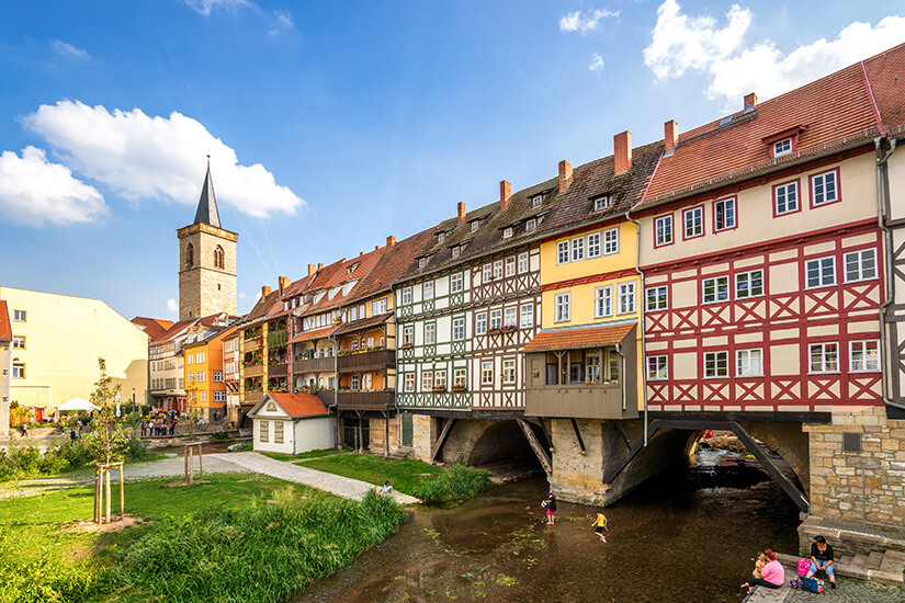 Das Besondere sind dabei jedoch die 32 dicht aneinandergereihten bunten Fachwerkhäuser, die auf Stelzen errichtet wurden. In diesen findet ihr kleine Antiquitäten- und Kunsthandsläden sowie Kunstgalerien. Hier entstehen tolle Mitbringsel aus Holz, Keramik oder Ton. An den beiden Enden der Brücke befanden sich einst zwei Kirchen – heute ist nur noch die Ägidienkirche am östlichen Kopf der Brücke erhalten. Um einen tollen Ausblick über die Dächer von Erfurt zu genießen, solltet ihr den 33 Meter hohen Kirchturm besteigen. Im Sommer lohnt sich eine Überquerung der Brücke übrigens besonders, denn jedes Jahr am dritten Juniwochenende findet hier ein kunterbuntes Altstadtfest statt.