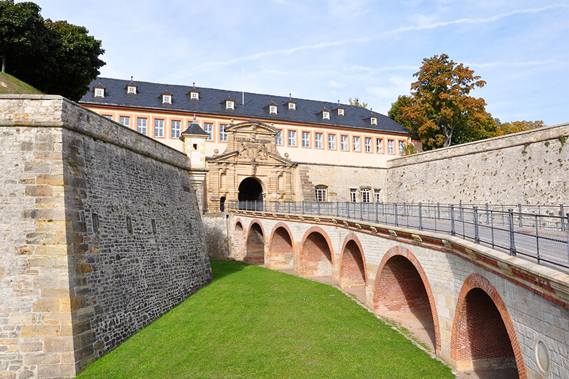 Die Zitadelle Petersberg ist eine barocke Stadtfestung, die seit dem 17. Jahrhundert über der Altstadt von Erfurt thront. Nach oben gelangt ihr entweder über einen Personenaufzug oder auf dem idyllischen Panoramaweg. Schon von Weitem werden euch die mächtigen Mauern ins Auge stechen. Früher befand sich an dieser Stelle ein Kloster der Benediktiner, bevor dieses in eine Militärbasis umgewandelt wurde. Die zur damaligen Zeit einzigartige sternförmige Anordnung machte es Feinden unmöglich, die Anlage einzunehmen – so genoss sie den Ruf als modernste Festung der damaligen Zeit.