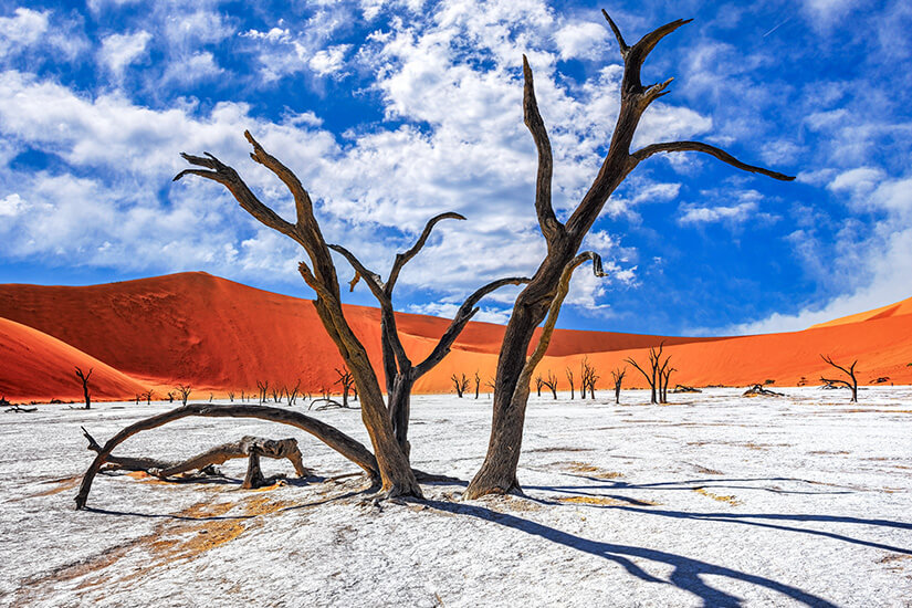 Fernreiseziele zwischen Wüste, Wildnis und Weite: Namibia bietet euch all’ das und noch viel mehr! Ein Land voller Kontraste, weiter Horizonte und stiller Schönheit. Ja, die Reise hierher ist lang – aber sie führt euch mitten ins Herz Afrikas, in eine Welt, die so ursprünglich ist, dass ihr euch kaum sattsehen könnt. Einer der eindrucksvollsten Orte ist das Deadvlei – eine surreale Tonpfanne im Herzen der Namib-Wüste. Dort stehen schwarze, abgestorbene Bäume auf leuchtend weißem Lehmboden, umgeben von orange glühenden Dünen. Wenn ihr früh morgens im ersten Licht auf dem Kamm der Düne 45 steht, werdet ihr verstehen, warum Menschen weite Wege auf sich nehmen: Diese Szenerie ist nicht von dieser Welt.