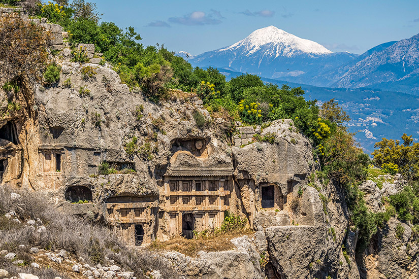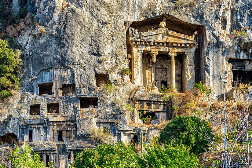 Zu der Zeit, als Fethiye noch Telmessos hieß, wurden oberhalb der Stadt etliche Grabstätten in den nackten Fels gehauen. Diese Felsengräber bilden heute die wohl bekanntesten Sehenswürdigkeiten der Stadt. Die ältesten davon stammen aus dem 6. Jahrhundert vor Christus. Das bekannteste der Felsengräber von Fethiye ist das Grab des Amyntas. Die Grabfront ist gestaltet wie ein ionischer Tempel, mit den charakteristischen Säulen und einigen Verzierungen. Dahinter befindet sich die Grabkammer. Macht euch auf den Weg hinauf und genießt von der historischen Stätte den Ausblick auf die Stadt.
