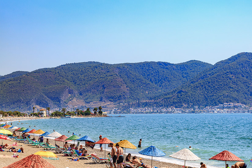 Möchtet ihr direkt in Fethiye an den Strand gehen, habt ihr dafür einige sehr schöne und saubere Möglichkeiten zur Auswahl. Der wohl schönste der Stadtstrände ist der Calis Beach. Feiner Sand und kleine Kieselsteine bieten auf mehr als zwei Kilometern Länge Badespaß für die ganze Familie. Der Strand fällt relativ seicht ins Wasser ab, weswegen der Calis Beach bei Familien mit Kindern sehr beliebt ist. Allerdings ist er aufgrund der Nähe zu vielen Hotels und der Innenstadt auch recht voll. Andererseits gibt es hier auch alles an Infrastruktur, was man sich nur wünscht.