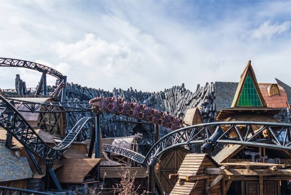 Für diesen sorgen zum Beispiel die Bahnen „Feuerdrache“ und „Drachenjagd“. So geht es auf dem Rücken des Feuerdrachens mit bis zu 60 Kilometer pro Stunde auf eine Reise durch Merlins Burg in längst vergangene Zeiten. Die „Drachenjagd“ hingegen lässt es etwas langsamer angehen und ist deshalb auch für jüngere Fahrgäste ideal. Wer zwischendurch etwas verschnaufen und einmal eine andere Perspektive einnehmen möchte, der wird stets herzlich auf dem Aussichtsturm willkommen geheißen. Die Panoramakabine bringt die Besucher auf eine Höhe von 63 Metern und ermöglicht ihnen durch Rotation einen fantastischen Ausblick über den gesamten Park.