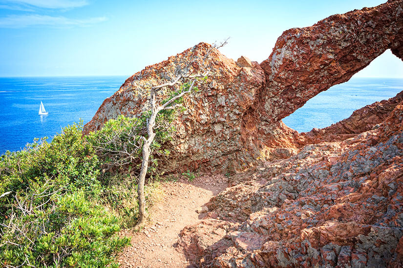 Nur wenige Kilometer von Fréjus entfernt erhebt sich das spektakuläre Esterel-Gebirge – ein Wanderparadies mit einzigartiger Landschaft, das ihr euch nicht entgehen lassen solltet! Die vulkanische Landschaft beeindruckt mit ihren charakteristisch roten Porphyr-Felsen, die einen dramatischen Kontrast zum tiefblauen Himmel und dem türkisfarbenen Meer bilden. Ein gut ausgebautes Netz an Wegen führt euch durch dichte Pinienwälder, über felsige Gipfel und entlang der Küste.