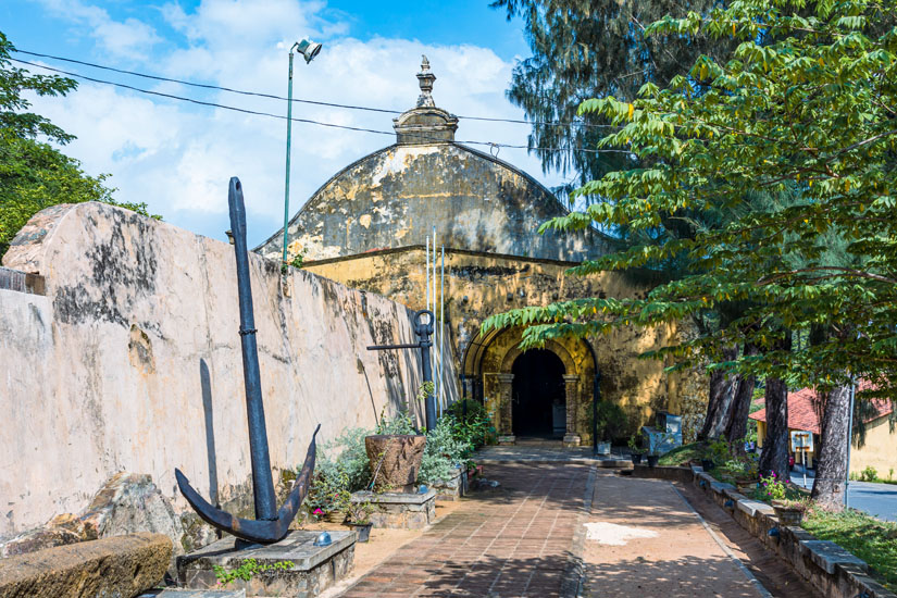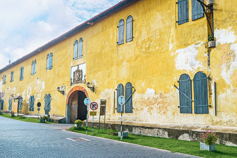 Beginnt eure Tour durch Galle am besten am sogenannten Old Gate, dem schönsten erhaltenen Tor zur Altstadt. Von außen ist das britische Wappen zu sehen und innen stehen die historischen Buchstaben „VOC“ (Verenigde Oostindische Compagnie. Sie sind von zwei Löwen und einem Hahn eingerahmt. Ein Teil des Tors dient bis heute als Warenhaus für Gewürze, und in dem integrierten Lagerhaus befindet sich das National Maritime Museum. Alternativ könnt ihr auch durch das Main Gate oder British Gate gehen, das zwar mehr Platz bietet, aber weniger hermacht.