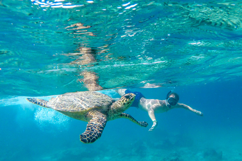 Bunte Fischschwärme und Schildkröten könnt ihr auf den Gili Inseln auch mit Tauchermaske und Schnorchel bestaunen. Tipp für umweltbewusste Reisende: Korallenriffe sind ein empfindliches Ökosystem. Um die Kinderstube unzähliger Fischarten zu erhalten, ist auf den Inseln der Gili Eco Trust aktiv. Bei einer geführten Eco-Schnorcheltour könnt ihr euch anschauen, wie das sogenannte Biorock-System das Wachstum der blühenden Unterwassergärten fördert.