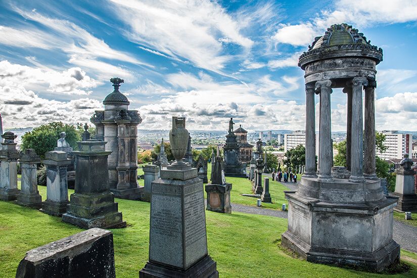 Die Kathedrale ist nach dem Schutzpatron Glasgows benannt: St. Mungo. Auf seinem Grab und in seinem Gedenken wurde die St. Mungos Kathedrale zwischen dem 12. und 14. Jahrhundert erbaut. Die unterirdische Krypta ist auf jeden Fall einen Besuch wert, möchtet ihr die Kathedrale allerdings in voller Pracht sehen, ist ein Ausflug über die Seufzerbrücke zum Kirchenfriedhof empfehlenswert. Auf dem höchsten der Hügel findet sich ein Denkmal für den Reformator John Knox – und von dort habt ihr eine fantastische Aussicht auf die Kathedrale und ganz Glasgow. Der Friedhof, auch Necropolis genannt, an sich ist ebenfalls einen Besuch wert, denn die viktorianischen Grabmäler und Tempel sind faszinierend anzusehen.