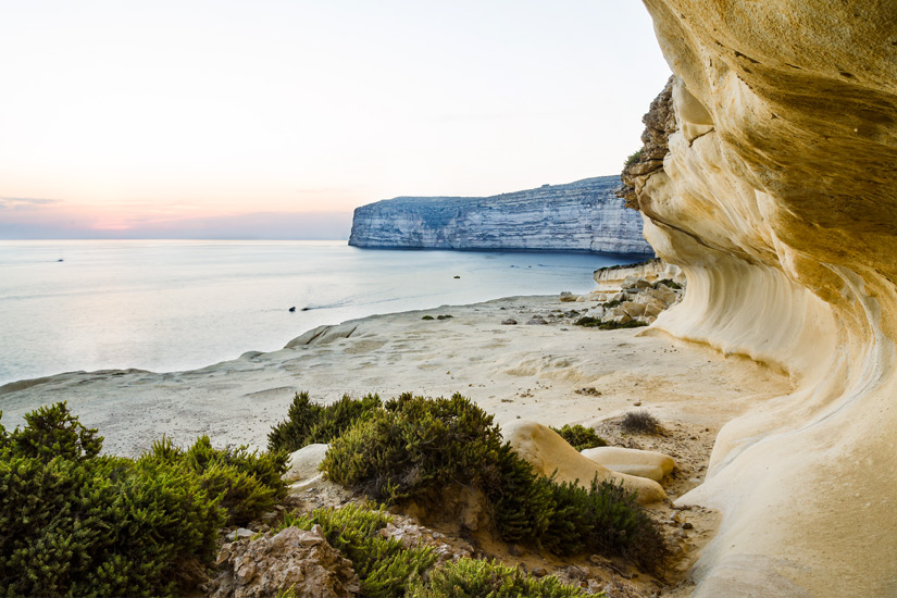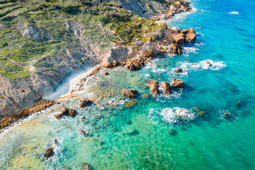 Ganz in der Nähe der Ramla Bay befindet sich die San Blas Bay. Der Strand hier ist etwas felsiger und mit mehr Algen übersät. Allerdings bringt dies auch den Vorteil, dass ihr hier mit etwas Glück ganz allein seid. Macht euch aber auf einen anspruchsvollen Abstieg vom Felsen zum Strand gefasst.