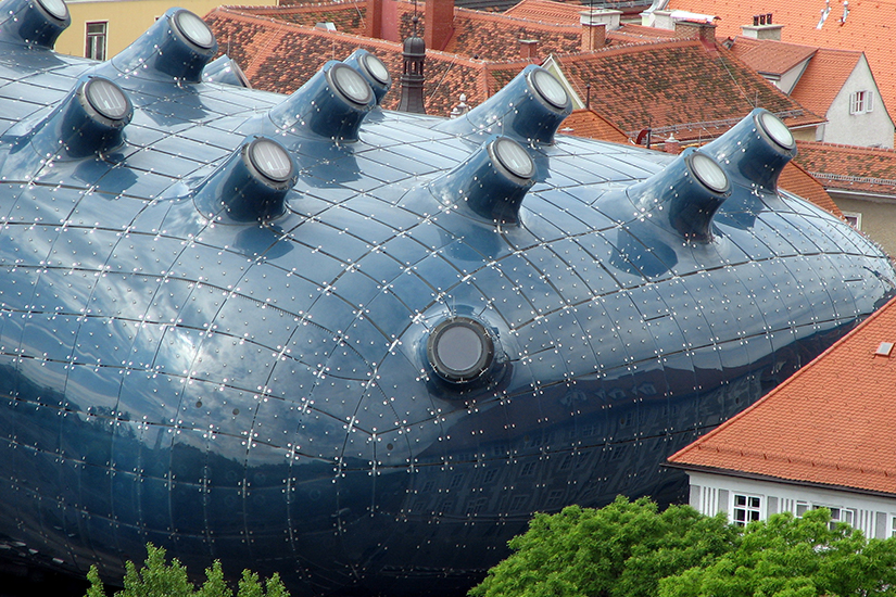 Ebenso wie die Murinsel wurde das Kunsthaus von Graz im Zuge der Europäischen Kulturhauptstadt im Jahr 2003 erbaut. Auch dieses Gebäude beeindruckt daher mit modernem Design, welches von zwei Londoner Architekten als „freundlicher Alien“ bezeichnet wird. Diesen Spitznamen hat es wohl den 1.000 Acrylglaselementen, der blauen Farbe, den roten Ziegeldächern sowie den 930 Leuchtstofflampen an der Außenfassade zu verdanken.