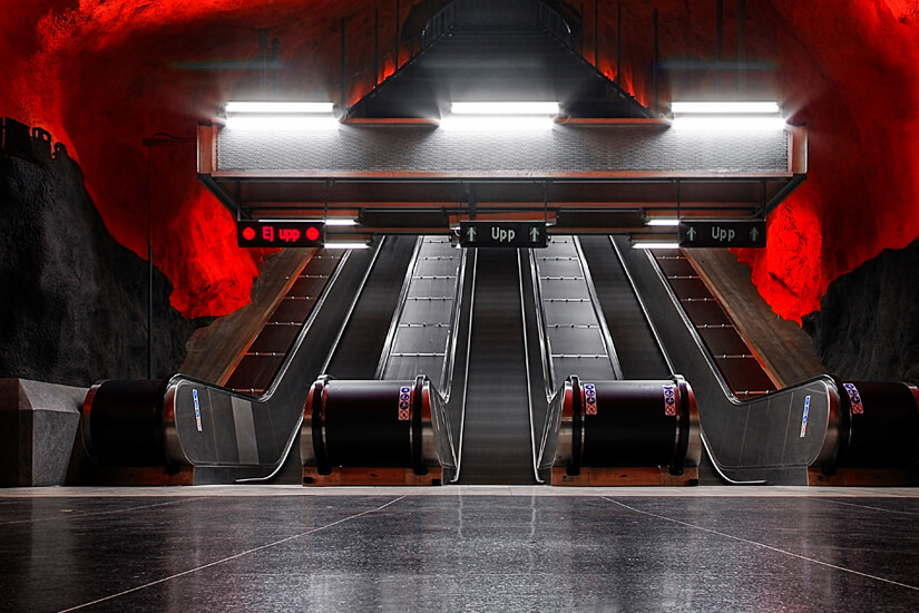 Falls ihr nicht wie andere kunstinteressierte Urlauber in eine Ausstellung gehen mögt, wie es im Moderna Museet (freier Eintritt) oder Fotografiska möglich wäre, probiert doch einfach etwas Neues ?. Setzt euch in die U-Bahn und fahrt Teile oder auch als Ganzes das 110 km lange Streckennetz ab. Mehr als 90 der 100 Stationen sind künstlerisch gestaltet worden, so dass das Ein- und Ausfahren oder auch nur das Warten auf die nächste Bahn zum Vergnügen wird. Meist haben U-Bahn-Stationen ja eher etwas Langweiliges oder gar Abschreckendes, nicht aber im Fall von Stockholm!