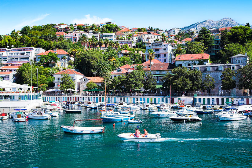 Feiner Kies, flacher Einstieg und lokales Leben zum Greifen nah machen den Strand ideal für Familien. Entlang der Promenade laden einfache Lokale zu regionalen Speisen und kühlen Getränken ein – zu Preisen, die angenehm bodenständig bleiben. Wenn abends die Sonne zwischen den Berggipfeln versinkt, färbt sich das Wasser goldfarben – so dass ihr ein Lichtspiel erlebt, das in Erinnerung bleibt.