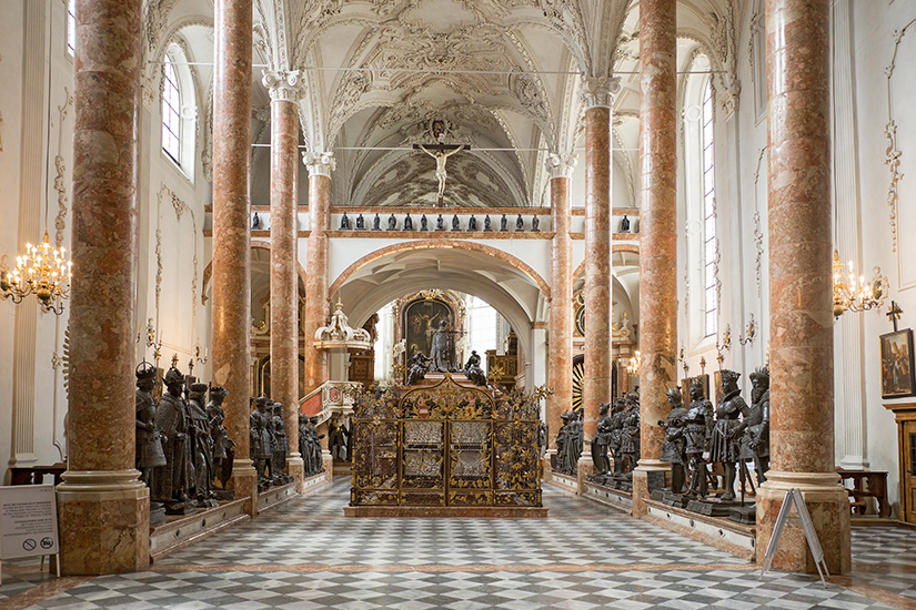 Die Hofkirche sollte eigentlich die Ruhestätte für Kaiser Maximilian I. werden. Doch wurde das Grabmal letztlich nicht als solches genutzt – daher trefft ihr auf ein leeres Kaisergrab in Form eines Sarkophags, der von mehr als 20 lebensgroßen Figuren umrahmt wird. Diese schwarzen Skulpturen verleihen der Hofkirche auch den Beinamen “Schwarzmanderkirche” und sorgen für ihr ganz besonderes Flair.