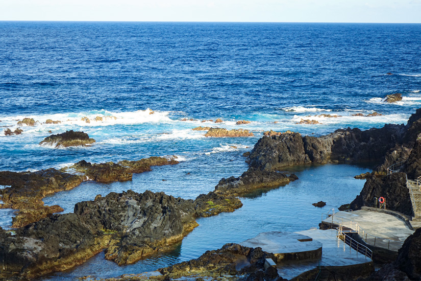 Liegt der Fokus auf ein paar Badestunden, solltet ihr in Richtung Inselhauptort fahren oder laufen. Dort findet ihr natürlich Pools vulkanischen Ursprungs, die sich perfekt in die Umgebung einfügen und trotzdem einen sicheren Badeausflug versprechen. Kein Wunder, dass es Einheimische und Urlauber gleichermaßen regelmäßig hierherzieht und die Piscinas Naturais folglich einen der wichtigsten Badespots auf ganz Flores markieren. Neben der Uferpromenade könnt ihr in den kleinen Becken entspannen, der Zugang zu dem paradiesischen Ort erfolgt über einige Treppen, ein Parkplatz ist vorhanden.