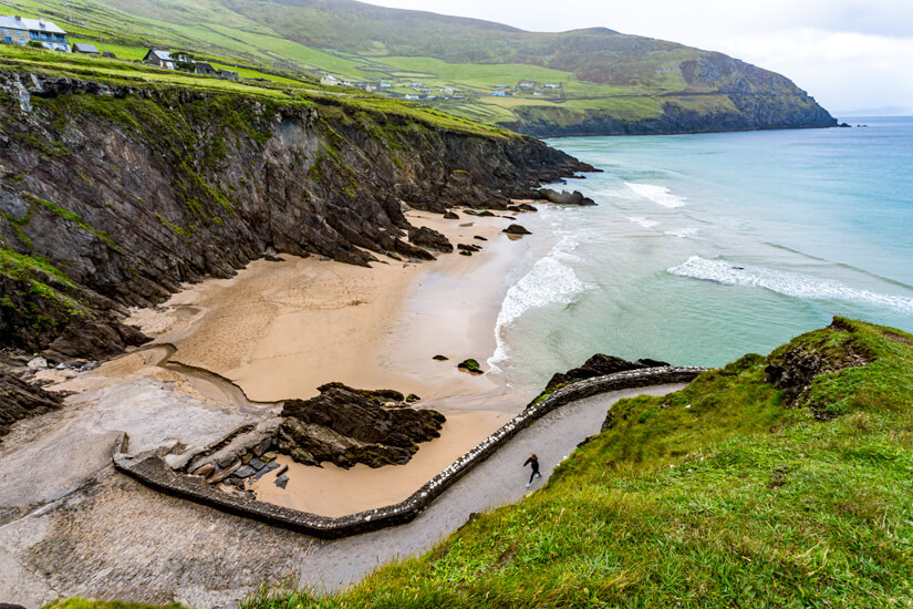 Ganz im Westen Irlands, circa 82 Kilometer von Killarney entfernt, ragt die Dingle Peninsula als nördlichste von fünf großen Halbinseln wie ein gigantischer großer Zeh in den Atlantischen Ozean hinein. Und wiederum im äußersten Westen der Landzunge liegt der Coumeenoole Beach, eine kleine, wunderschöne Sandbucht, ein Traum in Grün: Oben die saftigen Wiesen und hinter den Klippen das smaragdfarbene Wasser der Bucht, das weiter draußen in das Blau des Ozeans übergeht.