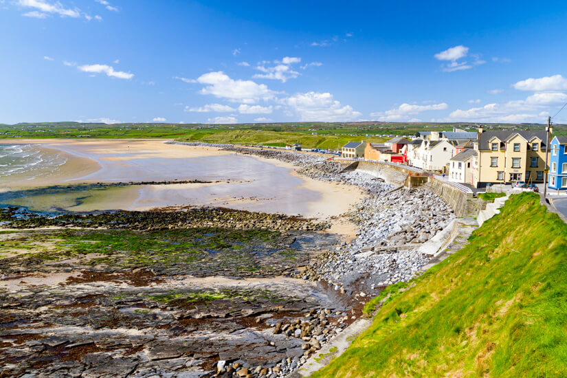 Am östlichen Ende der geschützten Liscannor Bay, eine Autostunde nordwestlich von Limerick, liegt der Lahinch Beach – ein kilometerlanger Sandstrand, schön breit und ein Eldorado für Badefreunde, Surfer, Kajakfahrer, Kitesurfer und Sonnenanbeter. Hier könnt ihr euch im Irland-Urlaub mal so richtig sportlich betätigen. Dieser schöne Strand ist wie für die ganze Familie gemacht: Im angrenzenden Ort Lahinch findet ihr Surfschulen, Geschäfte, darunter solche für Strandbedarf und irische Souvenirs. Darüber hinaus werdet ihr Bars, Restaurants und jede Menge Übernachtungsmöglichkeiten antreffen.