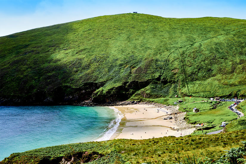 Vom Achill Sound, der Achill Island von der irischen Hauptinsel trennt, sind es nur 30 Minuten Fahrt bis zum Keem Beach. Ein Parkplatz und Toiletten befinden sich am Strand. In den wärmeren Monaten stehen die Chancen ganz gut, dass ihr hier auch einen Food Truck vorfindet.