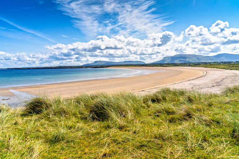 Ebenfalls am Wild Atlantic Way, doch weiter nördlich und auf der Hauptinsel, wartet der Mullaghmore Beach darauf, von euch entdeckt zu werden. Etwa drei Kilometer lang ist dieser Strand, unterbrochen nur von einer seichten Flussmündung und an einigen Stellen mehr als 150 Meter breit. Im Süden des Örtchens Mullaghmore beginnt die Badestelle, die sich in sanftem Bogen nach Südosten ausdehnt und so eine kleine Bucht bildet. Die Halbinsel Mullaghmore Head schirmt den Strand von der Atlantikströmung ab, der Sandstreifen ist gut geschützt.