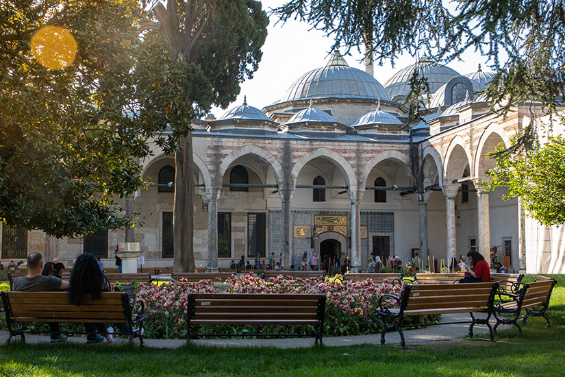 Inmitten der mit vielen Blumen angelegten Gärten wandelt ihr auf den Spuren der einstigen osmanischen Herrscher. Im Inneren der royalen Gebäude finden sich zum Beispiel alte Waffenkammern, Reliquien aus dem Islam und funkelnde Schätze. Ebenso könnt ihr den ehemaligen Harem besuchen, in dem teilweise mehrere tausend Frauen lebten.