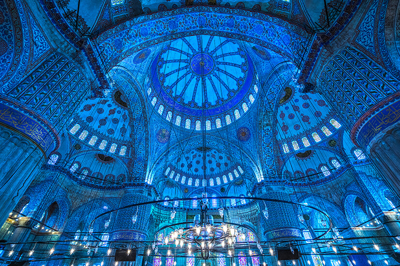 Die aufgrund ihrer blau-weißen Fliesen im Volksmund “Blaue Moschee” genannte Sultan Ahmed Moschee gilt als berühmteste ihrer Art in Istanbul. Wie die Hagia Sophia, neben der sie sich befindet, ist sie maßgeblich für die Silhouette der Stadt verantwortlich; das liegt vorwiegend an den sechs auffälligen Minaretten.