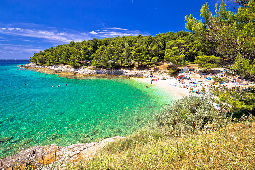 Doch nicht nur am Kap Kamenjak könnt ihr in Istrien einen wundervollen Badeurlaub verbringen. Die lange Küstenlinie bietet zahlreiche Strände und Badebuchten, die häufig mit Kies in flaches Wasser führen. Umsäumt von Pinienwäldern und imposanten Hängen badet ihr hier an gepflegten Stränden mit kristallklarem Wasser, von denen die meisten mit blauen Flaggen ausgezeichnet wurden. Von kleinen Felsbuchten über Kieselstrände bis zu künstlichen Steinplateaus erstreckt sich die Vielfalt, die an vielen Stränden durch ein umfassendes gastronomisches Angebot, Sanitäranlagen, Sport- und Freizeitangebote ergänzt wird. In der Hauptreisezeit kann es zum Teil ein wenig voll werden. Doch auch wer Abgeschiedenheit sucht, kann zwischen einsamen Buchten, Wassersport-Paradiesen und gut angebundenen Stränden mit toller Infrastruktur sein persönliches Highlight finden. Hier findet ihr eine Auswahl aus der Fülle der schönsten istrischen Bilderbuchbuchten.