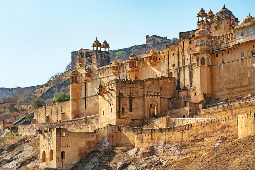 Doch nicht nur im Inneren der Stadt Jaipur gibt es tolle Sehenswürdigkeiten zu entdecken. Auch in direkter Umgebung der von Bergen umgebenen Stadt schlummern einige architektonische Schätze. Etwa elf Kilometer nordöstlich von Jaipur liegt der Bezirk Amber, der frühe eine eigenständige Kleinstadt war. Hier könnt ihr eine beeindruckende Festungsanlage besuchen, die aus Sandstein und Marmor erbaut wurde und imposant auf dem Bergkamm thront.