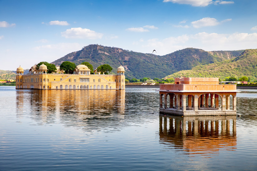 Auf dem Weg von Jaipur zum Fort Amber erwartet euch ein weiterer Höhepunkt. Unmittelbar an den nordöstlichen Teil von Jaipur angrenzend liegt der Man Sagar See, auf dem sich eine außergewöhnliche Sehenswürdigkeit befindet: Mitten auf dem Gewässer thront ein historischer Wasserpalast aus prächtigem, roten Sandstein. Das Gebäude, das auf dem Wasser zu schweben scheint, gibt ein tolles Fotomotiv ab, da es von Bergen umgeben ist und abends stimmungsvoll beleuchtet wird.