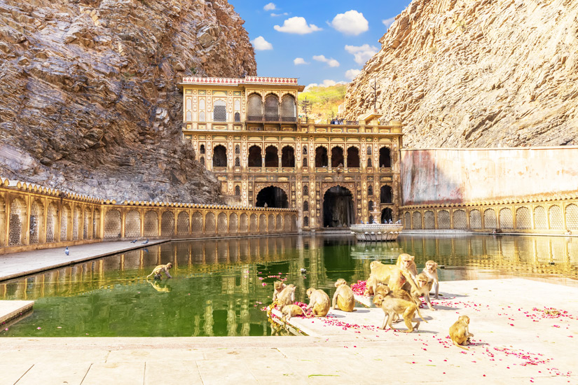 Östlich von der Stadt Jaipur liegt eine verlassene Tempelanlage, die als Geheimtipp gilt. Der im Volksmund auch „Monkey Temple“ genannte Ort beeindruckt durch schlichte, in die Natur eingegliederte Architektur und eine große Anzahl an freilebenden Affen. Hier erwartet euch ein Ort, der an Lebendigkeit kaum zu überbieten ist.