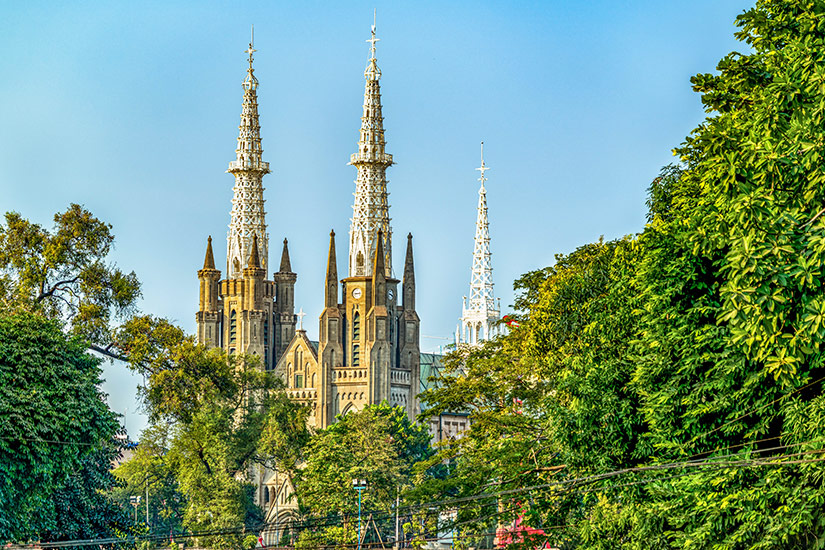 Das Christentum ist neben dem dominierenden Islam die zweitwichtigste Religion in Indonesien. Folglich befinden sich in Jakarta auch einige Kirchen, wovon die Kathedrale die wichtigste und imposanteste ist. Ihr findet sie nahe der Istiqlal Moschee, was so gewollt ist, da in Indonesien das friedliche Nebeneinander der Religionen einen hohen Stellenwert hat. Die erste Kathedrale wurde 1829 erbaut, brach aber 1880 unter dem Gewicht der Türme zusammen. Daher wurden die 77 Meter hohen Türme beim Neubau 1900 aus Teakholz errichtet. Die Kathedrale wurde im neogotischen Stil mit indonesischen Einflüssen erbaut und erhält durch die Holztürme eine besonders auffällige Optik.