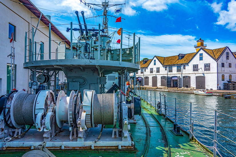 Das Gelände umfasst ehemalige Kasernengebäude, Werften und eine Kirche. Viele Bauwerke des Hafens dürfen aufgrund ihres Status als Sperrgebiet der Marine nicht betreten werden. Das Marinemuseum ist hingegen zugänglich und es begrüßt euch auf dem Sturmholmen-Eiland mit interessanten Exponaten. Darunter: ein echtes U-Boot, verschiedene Galionsfiguren, Modelle von Schiffen und ein Unterwassertunnel, der den Blick auf ein Wrack im Wasser freigibt.