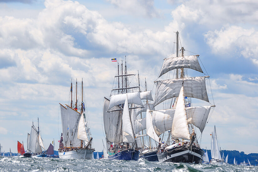 A propos Segeln: Das größte Segelevent im Norden von Europa lockt im Juni zahlreiche Sportler und Schaulustige nach Kiel. Die Kieler Woche hüllt die Stadt in eine lebendige Atmosphäre. Lange und kurze Ausflüge mit dem Segelschiff sowie ein buntes Unterhaltungsprogramm an Land prägen das Bild. Highlights sind ein spektakuläres Feuerwerk und eine Parade zu Wasser: die berühmte „Windjammerparade“.
