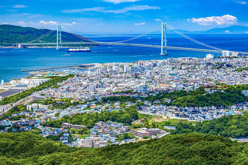 Kōbe ist über eine Autobahnbrücke direkt mit der Insel Awaji-shima verbunden. Selbst wenn ein Inselbesuch nicht auf der To-do-Liste steht, lohnt sich ein Blick auf die Brückenkonstruktion. Bei Tageslicht seht ihr, wie eindrucksvoll die Hängebrücke insgesamt 3.911 Meter Gesamtlänge zurücklegt. Bei Nacht wird sie zudem in buntes Licht gehüllt. Der Bau von 1998 galt lange Zeit als längste Hängebrücke der Welt. Erst 2022 musste sie diesen Titel an die in der Türkei befindliche Çanakkale-1915-Brücke abgeben, die nun mit 5.169 Metern Länge den ersten Platz belegt. Wer mehr über die Akashi-Kaikyō-Brücke erfahren möchte, findet das „Hashi no Kagakukan“, das Brücken-Wissenschaftsmuseum, im Stadtteil Tarumi-ku.