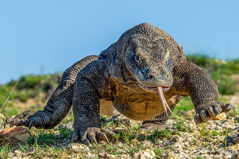 Der Komodowaran ist mit bis zu drei Metern Körperlänge die größte Echsenart der Gegenwart. Abseits der Insel Komodo gibt es wildlebende Exemplare nur noch auf den nahen Inseln Rinca, Flores, Gili Dasami und Gili Motang. Die Komodowarane leben also nur noch auf den ostindonesischen Inseln in Freiheit. Erwachsene Männchen wiegen bis zu 90 Kilogramm und obwohl sie oft träge wirken, können die Tiere beim Jagen bis zu 18 km/h erreichen. Sie sind auch für den Menschen gefährliche Raubtiere, denn neben ihren mächtigen Zähnen ist ihr Speichel giftig. Viele weitere Informationen zu den Komodowaranen erhaltet ihr im Informationszentrum auf der Insel, das zugleich Start- und Endpunkt der Tour bildet.