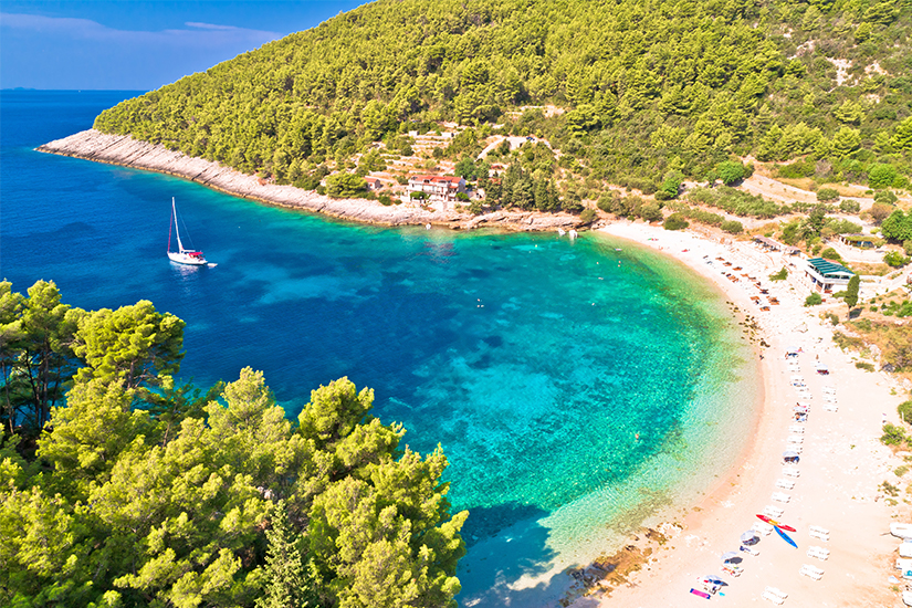 In Kroatien sind Sandstrände relativ rar gesät: Kein Wunder also, dass viele Urlauber auf Korčula nach Lumbarda mit seinem schönen Sandstrand strömen. Der Hafenort punktet mit verschiedenen romantischen Sandbuchten, die sich rund um die Hotels und auch etwas abgelegener vom Trubel befinden. Der Strand Vela Prznina gilt aufgrund seines flach abfallenden Verlaufs als Favorit bei Familien und Freunden des sicheren Planschens im Meer. Tipp: Wenn ihr ohnehin in Lumbarda seid, könnt ihr in dem gleichnamigen Hafenort auch eine Schiffstour starten oder eines der vielen Angebote rund um den Wassersport in Anspruch nehmen.