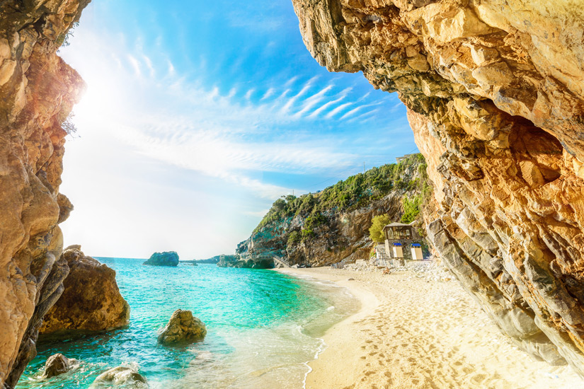 Um alle Buchten und am Wasser liegenden Höhlen zu erkunden, solltet ihr am besten eine Tour mit einem Motorboot unternehmen. Entweder nehmt ihr an einer geführten Tour teil und lasst euch die schönsten Gegenden zeigen oder ihr leiht euch selbst ein Boot aus. Denn wenn ihr in Griechenland ein Motorboot ausleihen wollt, braucht ihr keinen Führerschein, solange das Boot maximal 30 PS hat. So könnt ihr nach Belieben herumcruisen und an Stränden, die euch gefallen, einfach anhalten und ins kühle Nass springen.